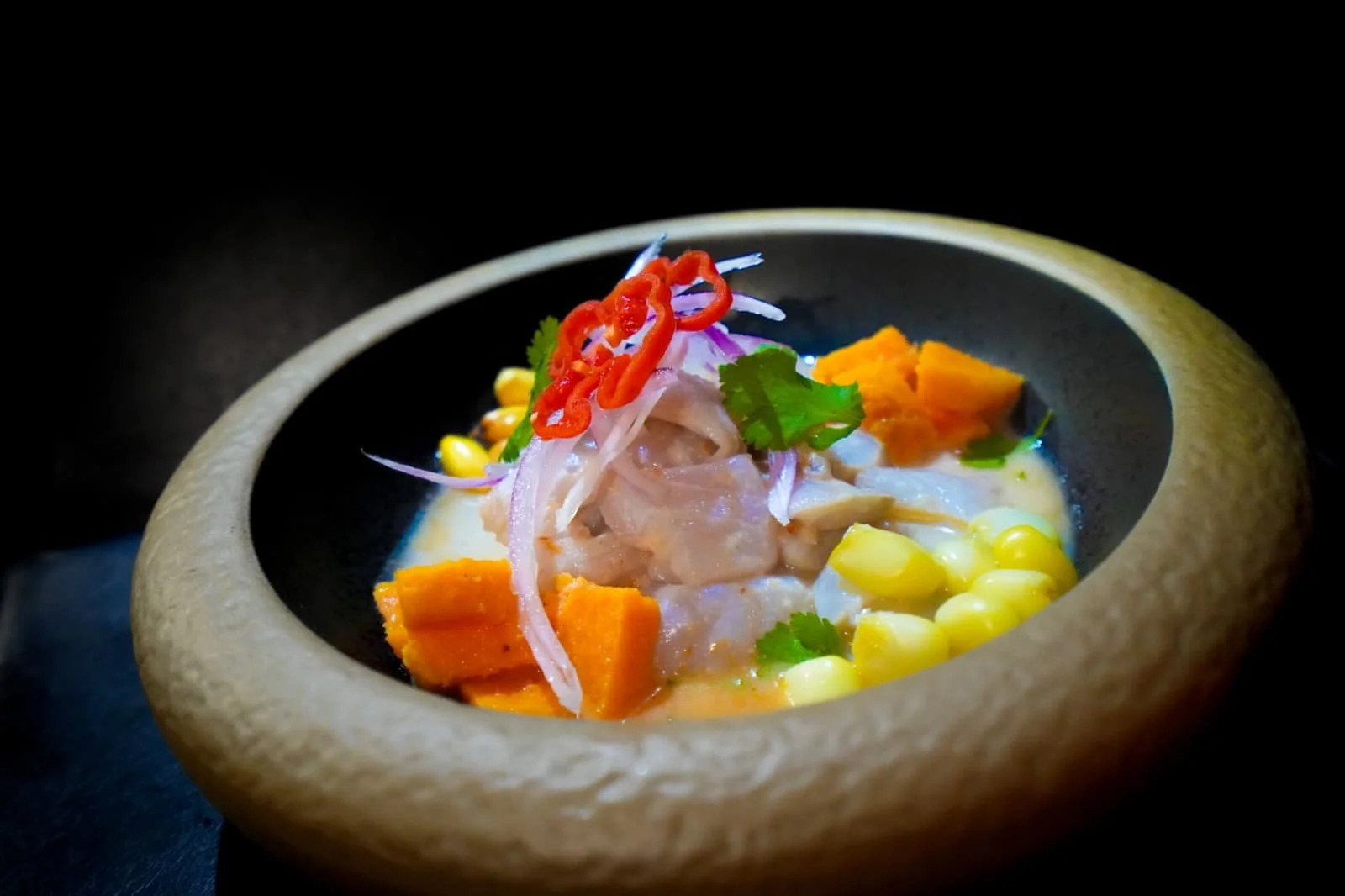 Descubre el auténtico sabor del Perú con nuestro ceviche peruano fresco, una explosión de frescura, limón y tradición que enamora cada paladar. Preparado con pescados de primera calidad, zumo de limón recién exprimido, cebolla roja, cilantro y ají, este plato es el reflejo perfecto de la gastronomía peruana.